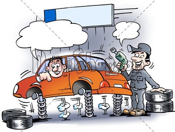 Cartoon illustration of a mechanic who just testing the shock absorbers on the car before the new tires mounted