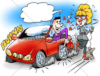 Cartoon illustration of a smart guy in his sports car showing the young lady the brand new wheels on the car