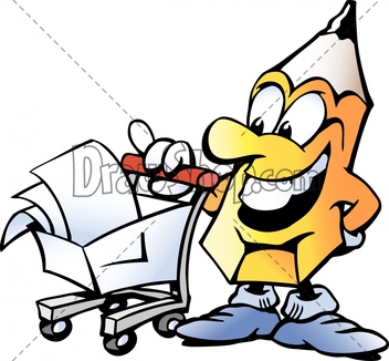 Cartoon Vector illustration of a Pencil standing in front of a Shopping Cart