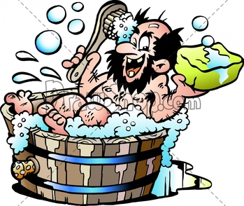 Cartoon Vector illustration of an Old dirty man who wash him selv in a Wooden Bathtub